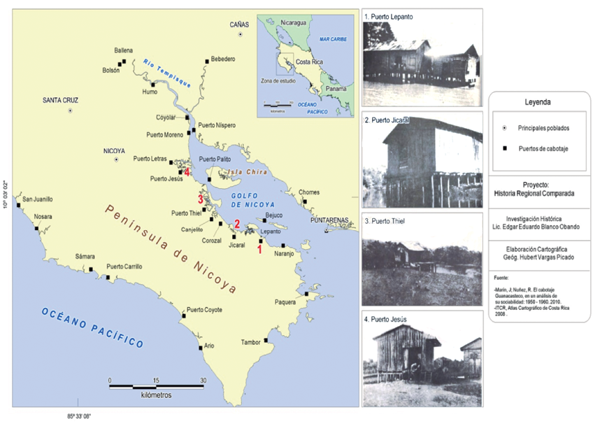 De acuerdo con Marín y Núñez (2011a), las principales poblaciones y ríos en los que se sustentó el cabotaje fueron los siguientes: poblaciones costeras de Arios, Bajos Negros, Barco Quebrado, Bejuco, Cabo Blanco, Cabuya, Carrillo, Estero del Barco, Las Peladas, Lepanto, Manzanillo, Montezuma, Naranjo, Paquera, Potreros, Puerto Soley, Puerto Viejo pun, Tamarindo, Tambor, Ventanas, Sámara, Chira, Chomes, Curú, Gigante, Las Agujas, Orgores, Piedra Amarilla y San Lucas. Mientras que los principales ríos y puertos fueron: Ballena, Bebedero, Bolsón, Colorado, Corozal, Coyolar, El Charco, Isla de Hora, Jicaral, Las Letras, Pochote, Puerto Humo, Puerto Jesús, Puerto Thiel, San Pablo y Taboga.