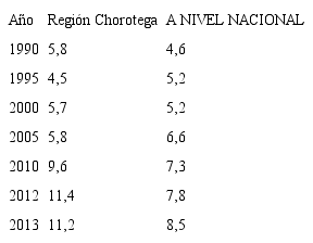Con respecto a la tasa de desempleo abierto, entendido como el porcentaje de población desocupada con respecto a la fuerza de trabajo, en la región Chorotega entre 1990 y el 2012, con excepción solo de 1995 y el 2013, se mantuvo en ascenso y por encima de la tasa nacional. Además, en este período la tasa de desempleo creció en un 5,4%, superando ampliamente al crecimiento de la tasa a nivel nacional (3,9%). Esto evidencia la consolidación del desempleo como una de las grandes problemáticas de la región Chorotega.