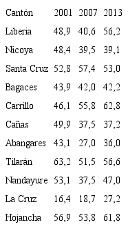 Posteriormente, entre el 2005 y el 2013, el nivel de pobreza se mantuvo muy similar a la década de 1990, sin mostrar una reducción importante. En la región Chorotega, la pobreza convencional se redujo apenas en 0,2%, mientras a nivel nacional la reducción fue del 3,1%. Por su parte, la pobreza extrema aumentó en 0,8% a nivel guanacasteco, mientras que a nivel nacional lo hizo solo en un 0,4%.
