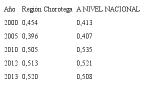 La condición de desigualdad se mide con el Coeficiente de Gini a través del ingreso de los hogares con valores entre cero y uno, donde cero representa la igualdad total y uno el mayor nivel de desigualdad. Entre los años 2000 y 2013, la región Chorotega mantuvo niveles de desigualdad similares al resto del país, aunque presentó un incremento del 0,066.