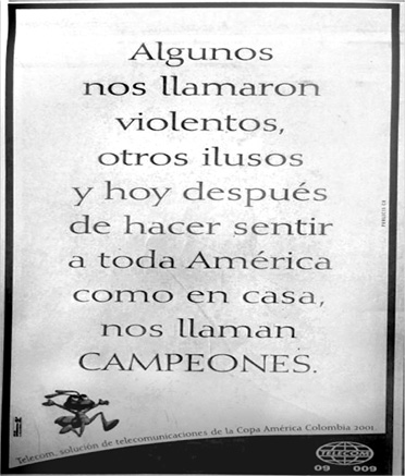 En primer lugar, la imagen publicitaria referente al triunfo de la Copa América del 2001 fue significada y constituida en relación al proceso de paz y a la idea de nación. Con lo anterior, el certamen deportivo asignó un significado en torno a la paz frente al secuestro y la violencia. Implicó también, la consecución de una definición de legalidad y control desde un referente institucional dirigido al espectador de la imagen.