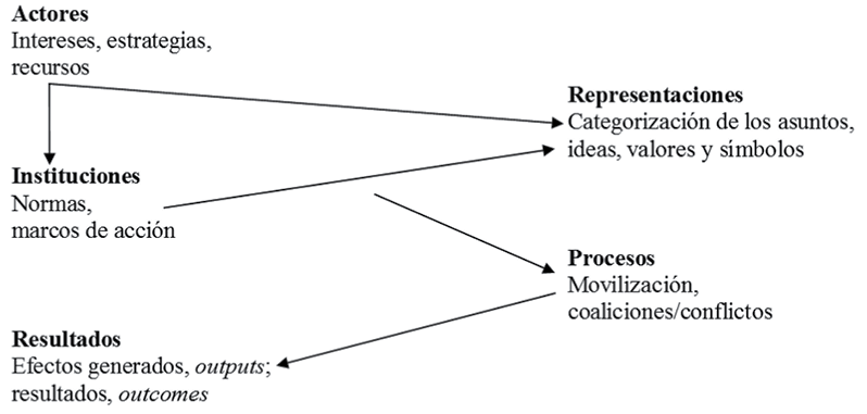 Bajo este enfoque de observación, la acción pública es vista como un proceso cuyo resultado no puede anticiparse, al derivar de la interacción entre actores, instituciones y representaciones, cuya relación no es lineal. Con fines analíticos y para poder dar cuenta de las variables intervinientes en la acción pública y sus vínculos, Lascoumes y Le Galés proponen el siguiente modelo: