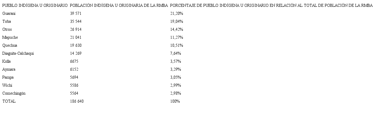 Estos datos se vuelven aún más relevantes si se considera que el 88,6% (165 432) de los indígenas de la rmba nació en la Argentina y que de ese total, el 61,1% (100 705) lo hizo en la provincia de Buenos Aires (indec, 2015).