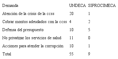 Para este trabajo se seleccionaron una serie de acciones cuya demanda se relacionó con la crisis de la ccss. Bajo esta etiqueta, se encuentran las reivindicaciones vinculadas con la apertura al diálogo y las acciones concretas para atender la crisis. Como se observa en la tabla 1, las diferencias en el número de demandas registradas para cada sindicato son significativas.