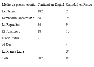 Las fuentes utilizadas para el análisis corresponden a noticias publicadas en medios nacionales de comunicación escrita, teniendo un total de 400 textos recopilados desde el año 1996 hasta el 2015, los cuales se encontraron en formato digital y físico, distribuidos según se muestra en la tabla 1.