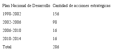 En la tabla 2 se presenta el total de acciones estratégicas identificadas para cada período gubernamental estudiado.