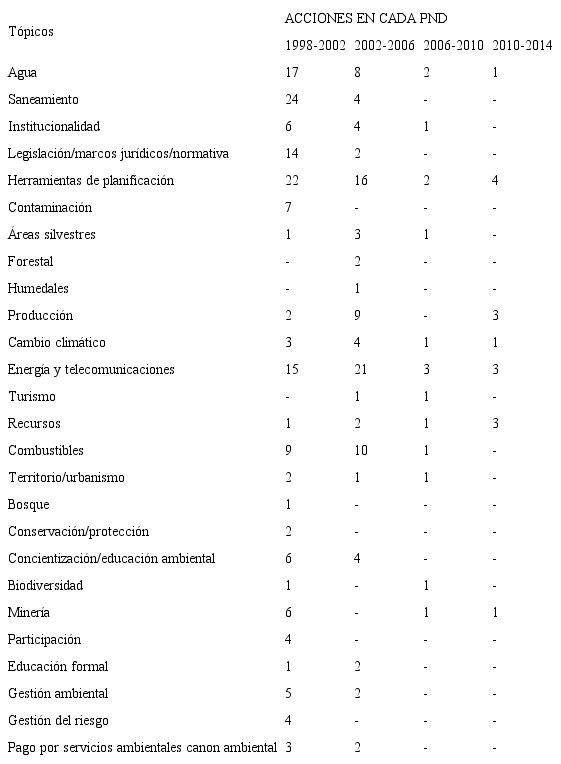 Por el momento, solo puede indicarse que no es tan clara la correspondencia entre los temas que son en mayor medida problematizados en medios de prensa y las intervenciones públicas en materia ambiental planteadas explícitamente en los pnd. Por ejemplo, el tema de saneamiento figura como uno de los que reportan un número importante de apariciones en las fuentes hemerográficas; no obstante, su presencia en pnd solo es identificable en los periodos 1998-2002 y 2002-2006.