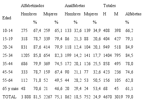Por grupos de edades, los más alfabetizados son los ubicados entre 20 y 34 años, porcentaje mayor al de niños de 10 a 14 años, los cuales ya deberían haber completado los primeros años de instrucción. Esto puede sugerir que el nivel de alfabetización se obtiene ya en edades productivas, pues el alfabetismo sube al avanzar las primeras edades y nuevamente disminuye en los grupos de edades más avanzadas.
