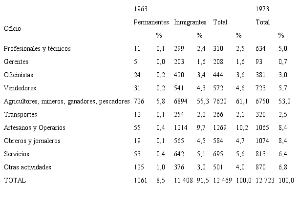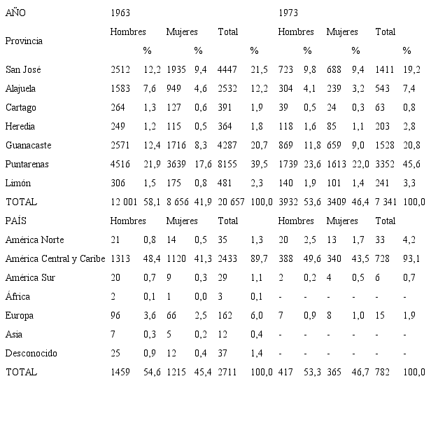 Otra característica de gran importancia en esta población es su condición migratoria y el lugar de origen de sus habitantes. Un análisis detallado de estos factores permite observar la composición de la población que fue atraída por la actividad bananera, las características de estas personas y las zonas de donde provienen, tanto del interior del país como del extranjero. En las tablas 7 y 8 se muestran los datos de los años 1963 y 1973.