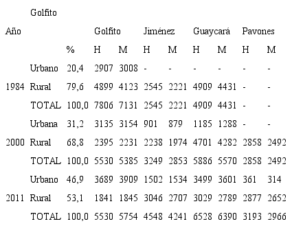 Elaboración propia a partir de la Dirección General de Estadística y Censos (1984),e Instituto Nacional de Estadística y Censos [inec] (2000 ; 2011).En primera instancia, se observa el aumento porcentual de población urbana y para el año 2000, se registra población urbana en los distritos de Jiménez y Guaycará. Además, en los años 2000 y 2011 se reporta una mayoría de población urbana en el distrito de Golfito, convirtiéndose en el primer distrito en urbanizarse. En el caso de Guaycará, este distrito alcanza una población total mayor que la del distrito central y logra un equilibrio entre su población rural y urbana hacia el año 2011. De esta manera, el Golfito después del finiquito es un cantón más urbano.