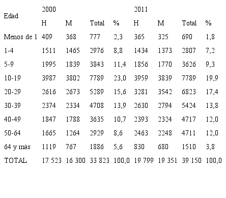 DISTRIBUCIÓN TOTAL Y PORCENTUAL DE LA POBLACIÓN POR SEXO Y GRUPO DE EDADGOLFITO, 2000 Y 2011