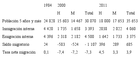 INMIGRACIÓN INTERNA, EMIGRACIÓN INTERNA, SALDO MIGRATORIO Y TASA NETA DE MIGRACIÓNGOLFITO, 1984, 2000 Y 2011