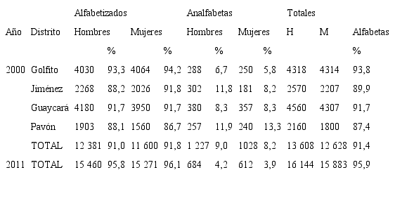 Elaboración propia a partir del Instituto Nacional de Estadísticas y Censos [inec] (2000; 2011).Una comparación de estos datos indica el avance en la alfabetización ocurrido en esta zona desde 1984 y hasta 2011, cuando la población que sabe leer y escribir pasa del 85,6% al 95,9%. En 1984, Jiménez es el distrito menos alfabetizado; en el año 2000, ya es el nuevo distrito de Pavones el que tiene esta condición, además, el que tienen mayor población indígena. En el siglo xxi, la diferencia entre sexos no es significativa y existe una leve ventaja de hombres analfabetos con respecto a las mujeres.