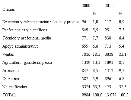 DISTRIBUCIÓN TOTAL Y PORCENTUAL DE LOS OFICIOS DE LA POBLACIÓN ECONÓMICAMENTE ACTIVA GOLFITO, 2000 Y 2011