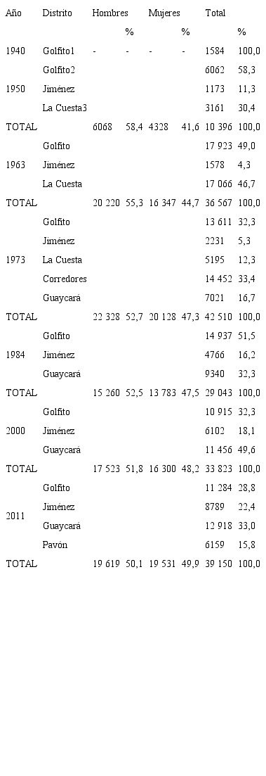 En 1950, el principal núcleo poblacional es la ciudad puerto de Golfito y concentra a la mayor cantidad de población. Este porcentaje baja en los dos censos siguientes y la población se distribuye más equitativamente entre los distritos de Golfito (donde se ubica el puerto) y La Cuesta, fronterizo con Panamá y donde se ubican una gran cantidad de fincas bananeras. Entre 1950 y 1973, en el distrito de Jiménez, el porcentaje disminuye al pasar de 11,3% a 5,2%. Esto evidencia la importancia que tomó la nueva ciudad-puerto y las zonas con las fincas de banano, lo cual deja como consecuencia la disminución del peso de la población de un asentamiento histórico en el Golfo Dulce como fue Puerto Jiménez.