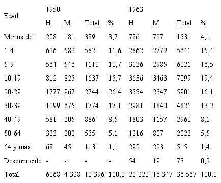 Elaboración a partir de la Dirección General de Estadística y Censos (1950; 1963).La primera conclusión de la tabla 5 es el peso de la población con las edades más productivas, y entre ellos los más jóvenes, ubicados entre 20-29 años. En 1950, en plena consolidación de la actividad bananera, este grupo representó más de la cuarta parte de la población. Inclusive, las personas en este rango representaban el 26,4% y el siguiente grupo, 30 a 39 años, representaba el 17,1% del total de la población. Así, la importancia del porcentaje de los hombres en edad productiva en esta población indica la gran atracción que significó Golfito para este tipo de personas. En total, el grupo entre 20-39 años, representaba un poco más del 43% del total.