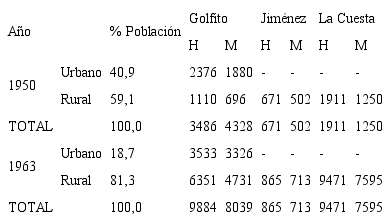 Esta proporción baja en 1963 a 29,3%, adquiriendo mayor importancia la población infantil, por ejemplo, el rango de 5-9 años aumenta en casi 6 puntos porcentuales. Esto puede sugerir la procreación de personas ya asentadas en el cantón. La población con mayor edad, de 40 años y más, prácticamente se mantiene equitativa porcentualmente en ambos periodos. En lo referente a la composición y distribución de la población golfiteña por zonas, en la tabla 6 se muestran los datos de acuerdo a los censos de 1950 y 1963.