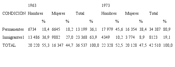 Para el año 1963, a nivel de sexo, gran parte de las personas migrantes son varones, debido a que el porcentaje de las poblaciones migrantes, interna y extranjera, poseen cifras superiores con respecto a los hombres. Entre estas dos poblaciones, el desequilibrio mayor se da en los migrantes internos con un 58,1% de hombres, en cambio, los extranjeros tienen una relación más pareja con un 54,6%. En el año 1973, esa relación desigual se mantiene, aunque disminuye en ambas poblaciones. De esta manera, se puede inferir que la migración interna correspondió mayormente a hombres solos, mientras la extranjera pudo involucrar más parejas o grupos familiares.