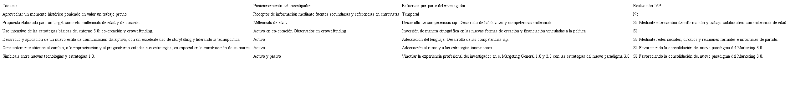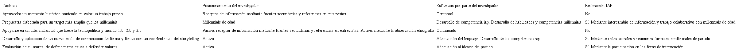 Se dedicaron más de 100 horas a la etnografía, además del tiempo empleado en el seguimiento de las comunicaciones online. Un trabajo de inmersión que además de servir para comprender los sentimientos y emociones que han alimentado el nuevo paradigma del Marketing Político 3.0, ha permitido participar de este y favorecer su consolidación. A continuación, se muestran en los cuadros 2 y 3, las tácticas de Marketing Político 3.0 implementadas por Podemos y Ciudadanos, así como, el posible trabajo en iap en cada una de estas.