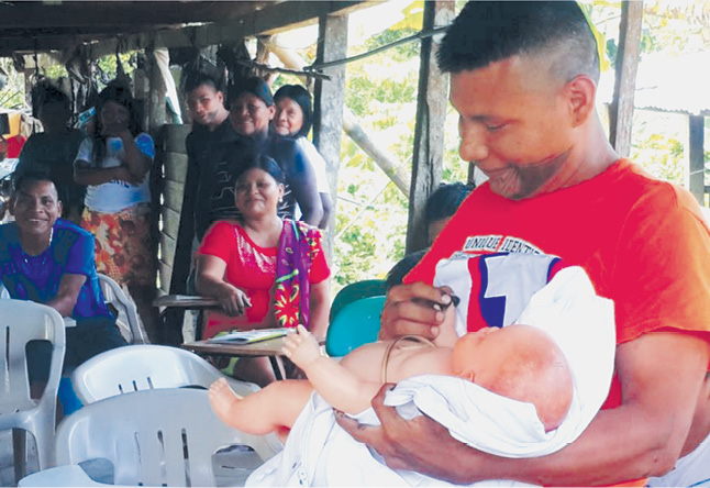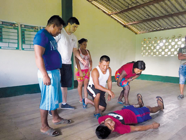 Clase práctica de soporte de vida básico en el adulto a una comunidad indígena Embera del Chocó, Colombia