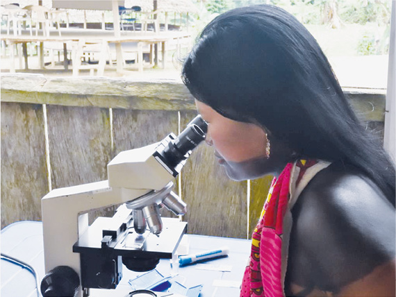 Mujer indígena aprendiendo a identificar parásitos al microscopio