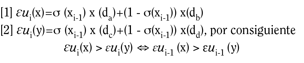 La interdependencia estratégica de los participantes ante condiciones de incertidumbre queda manifiesta. El problema de decisión se reduce a encontrar la estrategia óptima por medio del cálculo de la función de utilidad esperada de Von Neumann y Morgenstern (U: Ω→R), donde16: