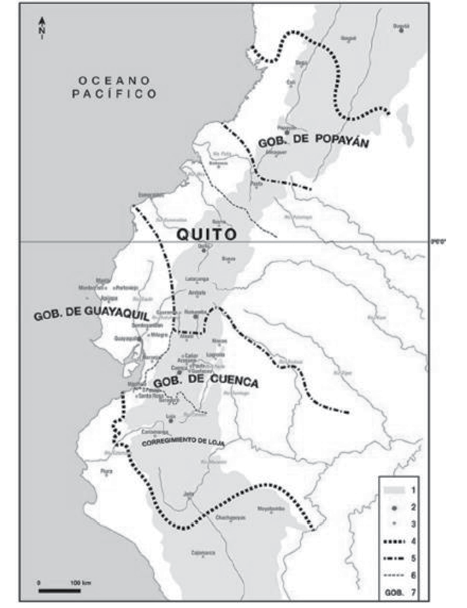A finales del siglo xviii, Cuenca, al igual que Quito y Guayaquil, enfrentó un proceso de reorganización político-administrativo bajo el influjo de las reformas borbónicas4 aplicadas por la monarquía española a la Real Audiencia de Quito. La monarquía tras sentir el debilitamiento de los lazos de dependencia de los criollos, buscó por medio de la organización burocrática tener acceso en todas las instancias de la vida económica de las colonias. En este contexto, en el año de 1777, el rey Carlos iii decretó la creación de la Gobernación de Cuenca5 (ver Imagen 1).
