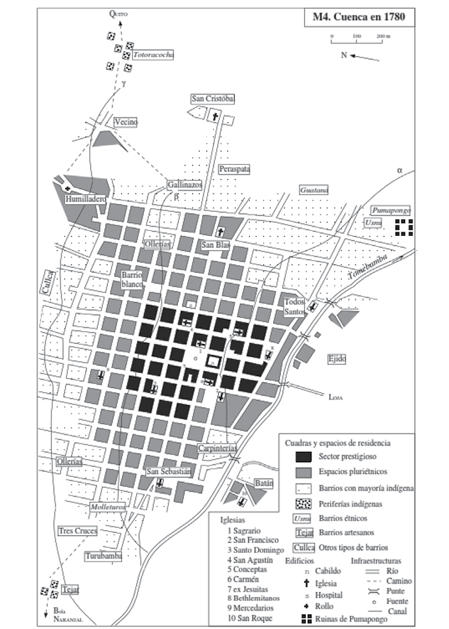 Jean Paul Deler, 2007. Adaptado y corregido por Ana Luz Borrero, 2016.El proyecto borbónico representó para Cuenca un sometimiento administrativo y económico hacia el poder central, aunque no en su totalidad6. Pese a la dependencia de origen de la Gobernación de Cuenca con el Virreinato de Nueva Granada, existía una cierta autonomía política y económica condicionada a cumplir y hacer cumplir el objetivo final de las Reformas Borbónicas (Chacón et ál, 1993); sirva de ejemplo, la exacción económica dirigida a propietarios de tierras, comerciantes y población indígena7. De esta manera, con el objetivo de definir a la población tributante y no tributante, la Gobernación de Cuenca llevó a cabo un proceso de identificación de los y las habitantes, basado principalmente en los rasgos étnicos. Razón por la que, a finales del xviii, Cuenca enfrentaba un fuerte proceso migratorio capaz de trasformar el cuadro estático de la sociedad colonial. La nueva dinámica poblacional le permitió a la ciudad experimentar un notable crecimiento demográfico que demandó nuevas exigencias de consumo y comercio.