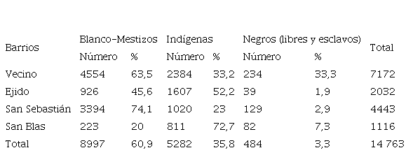 Censo de Vallejo (Poloni, 1997).Pese a las limitaciones que pueda eviden-ciar la fuente10, es claro que el centro de la ciudad era habitado por una mayoría de blancos-mestizos, mientras que los indígenas alcanzaban un tercio de la población. Así, los barrios de la ciudad fueron clasificados en barrios de blancos, de indios y de mestizos, de acuerdo a la condición socio-étnica de sus habitantes.