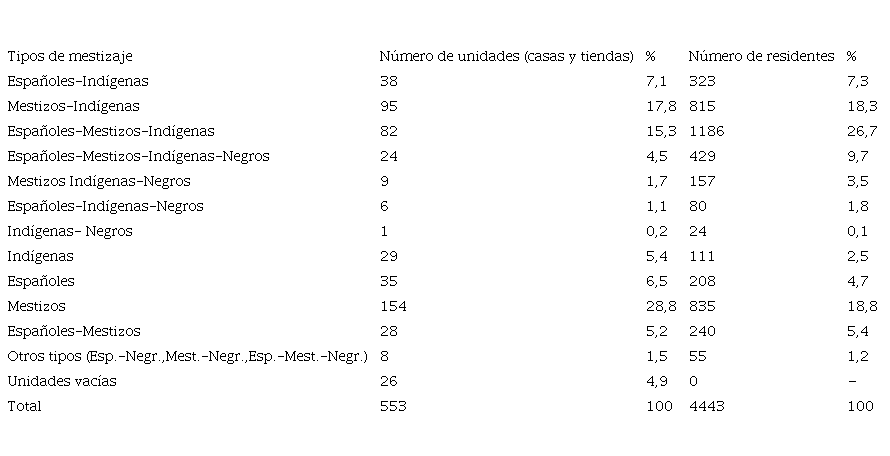 Poloni (1997, p 435).En la imagen 2, en el plano de la ciudad se evidencian zonas de prestigio, espacios pluriétnicas, barrios con mayoría indígena, periferias indígenas, sectores artesanales. Sin embargo, no es posible hablar de espacios meramente homogéneos. Pese a la gran segregación étnica que existió en la época, el área urbana de la ciudad sirvió de plataforma para la interacción entre los sectores de la élite con los sectores populares11. La tabla 2 evidencia el mestizaje no solamente a nivel de “barrio”, sino también de unidad de residencia en San Sebastían.
