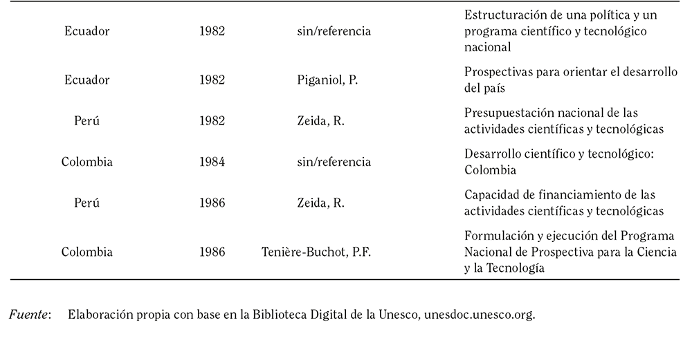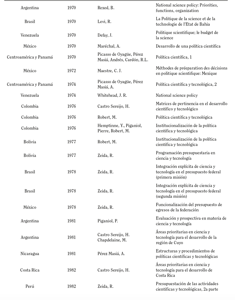 Además de las reuniones regionales y de las misiones de expertos, la Unesco publicó una serie de volúmenes sobre la región latinoamericana pertenecientes a la colección Estudios y Documentos de Política Científica. Dicha colección tenía como objetivo reunir, analizar y difundir información sobre la organización de la investigación científica en los Estados miembros, aunque también incluía diagnósticos y estudios normativos. Puntualmente, esta serie contenía tres tipos de documentos: a) los Estudios por País, llevados a cabo por las autoridades gubernamentales responsables de la política científica; b) los Estudios Normativos, elaborados por consultores de Unesco referidos a planificación en política científica u organización y administración de la investigación científica y tecnológica; y, c) los Informes de reuniones internacionales de política científica convocadas por la Unesco (Lemarchand, 2010).