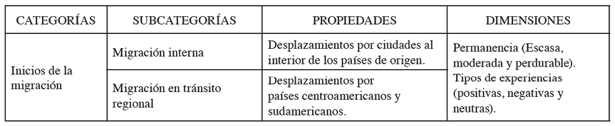 Conforme con las bases de la Teoría Fundamentada, la categoría presentada en estos resultados es inicios de la migración y las subcategorías son migración interna y migración en tránsito regional. Para migración interna, la propiedad es desplazamientos por ciudades al interior de los países de origen y para migración en tránsito regional, se trata de desplazamientos por países de la región sudamericana y centroamericana. La principal dimensión observada se vincula al tiempo de permanencia en esos contextos, lo que posee una variabilidad significativa, por lo que puede ser escasa, moderada y perdurable (tabla 1). Además, otra dimensión involucrada hace a los tipos de experiencias que pueden ser positivas, negativas o neutras de acuerdo con como transitan sus identidades de género.