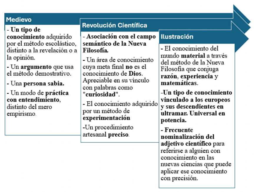Si en inglés el sustantivo scientist fue inventado en 1834 para nombrar a un grupo de personas que ya ocupaban un lugar en la sociedad, el origen de su contraparte hispana no puede atarse a un evento tan preciso, pues emanó de un contexto más amplio de evolución conceptual. El adjetivo “científico” o “científica” se utilizó con alguna frecuencia en los últimos siglos del Medievo. Su nominalización fue rara, aunque existió al menos desde el siglo XV, y se volvió más común a medida que se desarrolló la Revolución Científica, volviéndose común durante la Ilustración (Figura 1).