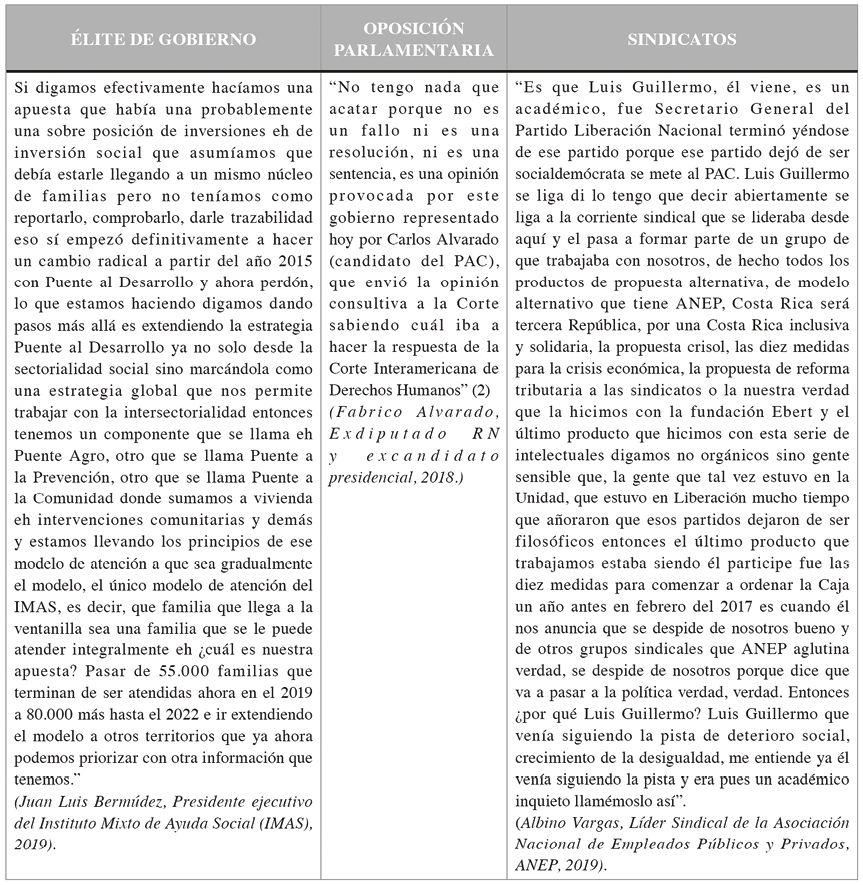Así, la narrativa de la élite de gobierno bajo el PLN está localizada en metáforas como un país grande, glorioso, ejemplar, es una “élite visionaria” de grandes inversiones y construcción, muy asociado con el ala de la redistribución; mientras que en el caso del PAC aduce recuperar las virtudes de solidaridad, y agrega la diversidad, actualizando una narrativa estatal a la discursividad contemporánea internacional, es una “élite inclusiva” más en la línea de incluir el reconocimiento propia de miradas más progresistas (Carballo, 2020, p. 181).