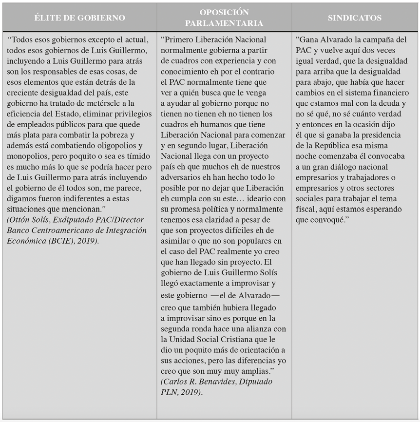 En el caso de los intereses, la oposición parlamentaria estuvo liderada por el PAC en el período 2006-2010, y aunque no logró evitar la aprobación del TLC, que era su principal objetivo, logró identificarse como uno de los nuevos partidos grandes del siglo XXI (aunque para las elecciones de 2022 desapareció completamente del parlamento), con una agenda más centrada en un Estado austero, cuidadoso y con una agenda ciudadana basada en la inclusión y el reconocimiento. Esto tuvo una relativa continuidad en el período de gobierno de Laura Chinchilla. En el caso de Luis Guillermo Solís del PAC, quién tenía ideas más progresistas, tanto sociales como económicas, fue atacado por el PLN, que buscaba recuperar una legitimidad afectada durante las elecciones en el 2014 con un candidato en aquel momento que dejó grandes dudas sobre la entereza ética del partido (Johnny Araya). Durante el gobierno de Carlos Alvarado tanto los diputados del PLN como del PAC y otros también del ala neoliberal del PUSC, se pusieron de acuerdo para pasar proyectos de ley, es decir, al menos en los primeros dos años, la asamblea tuvo una disposición no habitual para pasar proyectos, entre ellos, el más polémico de todos, la reforma fiscal. El interés del ala más conservadora en el 2018-2019 centró y centra su interés en comunicarse con sus seguidores, y la dinámica política, bajo lecturas morales de las leyes, alejados de toda discursividad de derechos humanos y progresismo. Asimismo, atacan constantemente al gobierno (siendo o no cierto lo que se aduce) para concentrar aún más su comunicación con los sectores o zonas que los apoyan; zonas que están concentradas sobre todo en las regiones más empobrecidas o con registros de bienestar social bajos (Rodríguez et al., 2019).