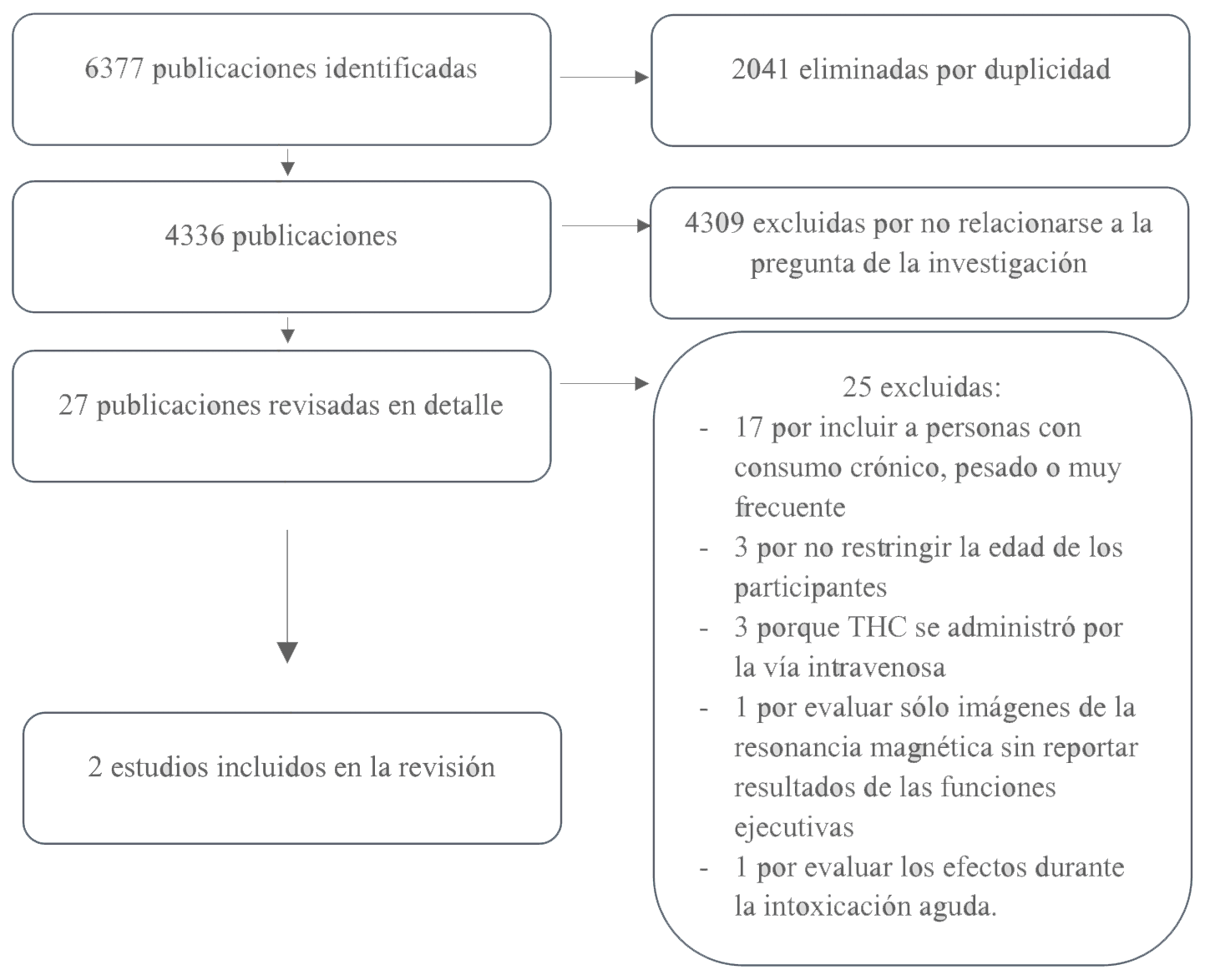 Fuente: Elaboración propia, 2024.. En caso de ser factible, los resultados de las investigaciones identificadas serían combinadas para su análisis y síntesis en un meta-análisis, usando el programa RevMan 5.3.5.La búsqueda identificó 6377 publicaciones (Figura 1). La gran mayoría de ellas fueron excluidas al leer el resumen, pues claramente no eran aplicables para el objetivo de este estudio, ya que eran estudios con otras sustancias, pero las personas dentro de la descripción habían consumido cannabis alguna vez en su vida, era consumo de marihuana de uso crónico o con otras sustancias, etc. Esa selección inicial dejó un total de 27 estudios que fueron analizados en detalle para determinar su pertinencia para el tema en cuestión. De los 27 estudios analizados en detalle, 25 fueron excluidos porque no cumplían con los criterios especificados: 17 de ellos porque incluyeron a personas con consumo crónico, pesado o muy frecuente, 3 porque no restringían la edad de los participantes, 3 porque THC se administró por la vía intravenosa, 1 porque solo evaluó imágenes de la resonancia magnética sin reportar resultados de las funciones ejecutivas y 1 porque evaluó los efectos durante la intoxicación aguda.