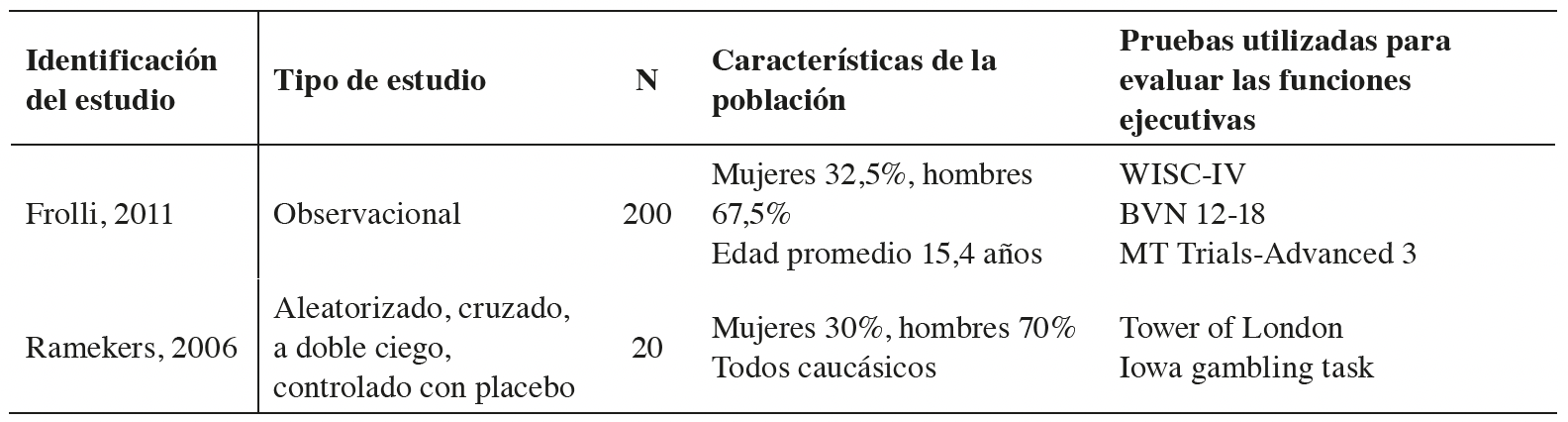 Fuente: Elaboración propia, 2024.Una de las dos investigaciones que sí cumplió con los criterios de inclusión fue un estudio observacional que incluyó a 300 jóvenes, entre 15 y 16 años de edad, provenientes de 20 escuelas secundarias de dos provincias de Italia (Frolli et al, 2021). De acuerdo con la frecuencia reportada de consumo de cannabis, los y las jóvenes que provenían de ambientes socio-culturales similares, fueron divididos en tres grupos de acuerdo con sus respuestas a un cuestionario: los consumidores crónicos (al menos 4 veces a la semana por un mínimo de 1 año), los consumidores ocasionales (aproximadamente una vez cada dos semanas por al menos 1 año) y los controles (no usaban cannabis); se excluyó a los que usaban cualquier otra sustancia. A los participantes se les aplicaron 3 pruebas: Wechsler Intelligence Scale for Children-IV (WISC-IV), Batteria di Valutazione Neuropsicologica per la Adolescenza (BVN 12-18) y MT Trials-Advanced 3, todas ellas empleadas con el fin de medir las habilidades intelectuales y la evaluación neuropsicológica en los niños, las niñas y en las personas adolescentes. WISC-IV consiste en 15 pruebas, agrupadas en 4 índices que evalúan el razonamiento perceptivo, la comprensión verbal, la memoria de trabajo y la velocidad de procesamiento en las personas entre los 6 y 16 años. BVN 12-18 es una batería de exámenes, que incluye la prueba ToL (Tower of London), que evalúa las funciones ejecutivas superiores, como las destrezas para el planeamiento y la solución de problemas, y la prueba Corsi que evalúa la memoria visoespacial. MT Trials-Advanced 3 evalúa las discapacidades de aprendizaje en los adolescentes en aspectos, tales como la lectura, las habilidades para la comprensión de textos y las destrezas matemáticas.
