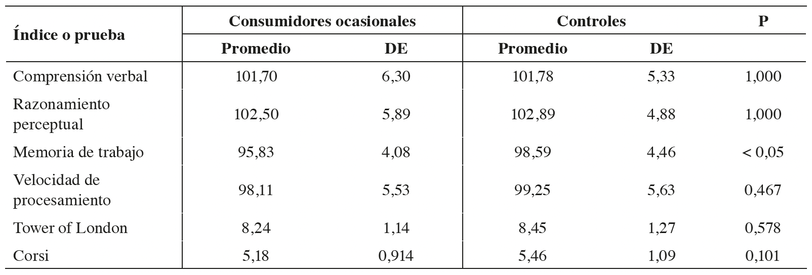 El grupo de consumidores crónicos tuvo resultados significativamente inferiores en todos los dominios evaluados en comparación con los otros grupos, pero, debido a la pregunta de la presente investigación, no se incluyen en el presente análisis. Por lo tanto, para los fines de esta revisión el análisis se centró en los 200 jóvenes restantes, de los cuales 100 eran consumidores ocasionales y 100 eran controles. La edad promedio era 15,4 años y 32,5% eran mujeres; no se proporcionaron otras características basales. Al compararlo con el grupo de los controles, se detectó que los consumidores ocasionales tuvieron un puntaje inferior, estadísticamente significativo, en las pruebas para evaluar la memoria de trabajo; no hubo diferencias significativas en los restantes índices evaluados (tabla 2). Con respecto a la evaluación de las destrezas matemáticas y de lectura, en el grupo de los consumidores ocasionales, un 4% fueron diagnosticados con dislexia, 4% con discalculia y 6% con ambas condiciones; en el grupo de los controles los porcentajes fueron 2%, 1% y 4%, respectivamente. Este estudio fue clasificado con un riesgo serio de sesgo.