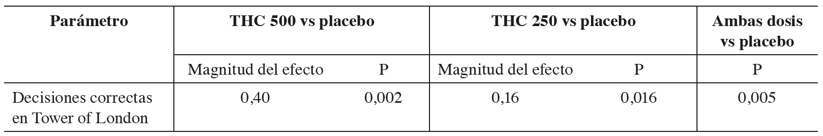 Por su parte, el estudio de Ramaekers et al. (2006) tiene una muestra pequeña, pero el diseño de experimentación es más sólido. Además, por tratarse de un estudio cruzado, cada participante funciona como su propio control, lo que reduce la posibilidad de sesgos. Aunque el límite superior de edad permitido era un poco mayor al establecido para esta investigación, por común acuerdo se decidió incluirlo, antes de conocer los resultados, debido a la escasez de la información y a la mayor solidez de su diseño metodológico. Aún con un número reducido de participantes, en esa investigación se detectó que, en comparación con el placebo, al fumar dos dosis diferentes de cannabis había una reducción estadísticamente significativa en el número de las decisiones correctas en la prueba Tower of London.