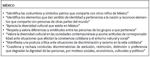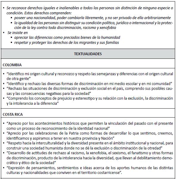 • Colombia aplica estas actitudes antidiscriminatorias a situaciones que pueden ocurrir en el medio escolar y en la comunidad. Costa Rica manifiesta aprecio por las diferencias culturales que conviven en su territorio. México valora las diferencias y similitudes entre las personas, y manifiesta que toda discriminación afecta la convivencia y degrada la dignidad de las personas.