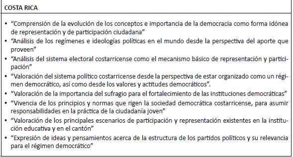 • Colombia hace referencia a la administración de la justicia y a su control para evitar abusos. Costa Rica pone el énfasis en la valoración del régimen democrático costarricense y de su sistema electoral, y se refiere en forma explícita, a la relevancia de los partidos políticos para el ejercicio de la democracia.