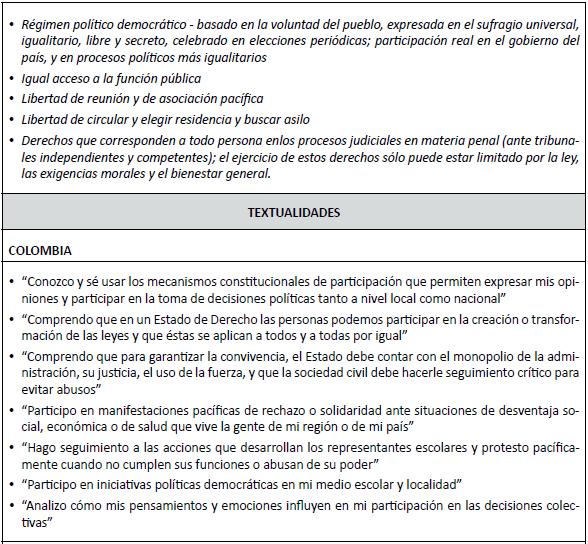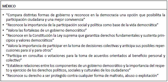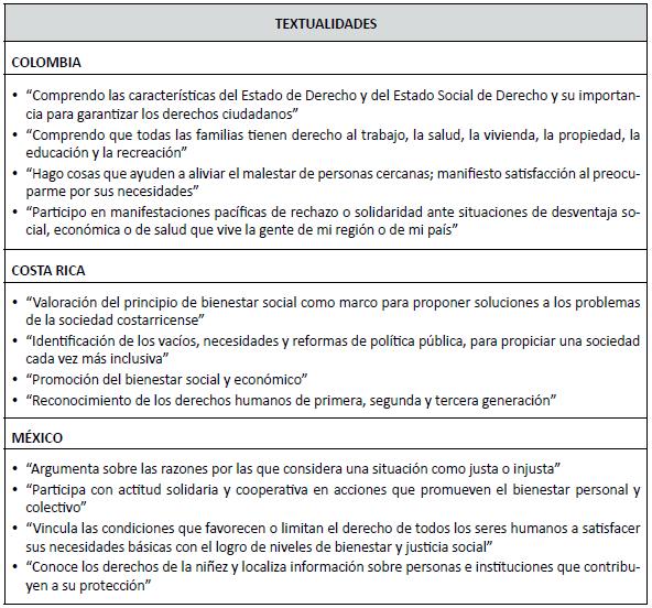En los Cuadros que se acompañan se comparan las textualidades, es decir las referencias literales incluidas en los lineamientos curriculares de formación ciudadana de estos países, con las categorías antes mencionadas de la Matriz. Los lineamientos curriculares han sido formulados por el sistema educacional de estos países como objetivos o aprendizajes por alcanzar, y se refieren tanto a conocimientos como a las actitudes y a las habilidades, que aquí se intenta comparar con cada una de las siete categorías de la Matriz.1