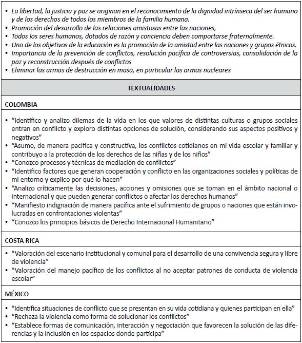 • Colombia acentúa la importancia de identificar las causas de los conflictos y conocer las técnicas o mecanismos de resolución pacífica. Costa Rica rechaza la violencia escolar y valora la convivencia, pero sin hacer referencia al plano internacional. México intenta identificar las situaciones de conflicto y propone formas de comunicación y negociación para una solución pacífica.