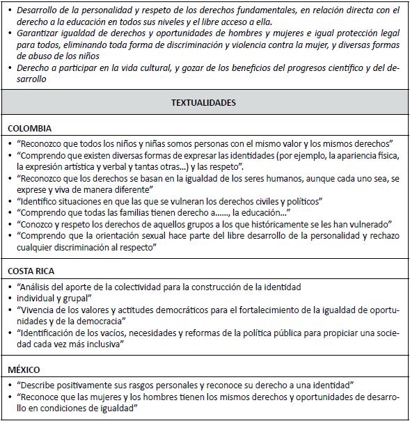 • De la misma manera, el concepto de igualdad de los seres humanos está presente en todos los lineamientos curriculares. Colombia describe con mayor detalle este derecho y lo expresa en forma concreta. En el desarrollo de la identidad incluye además, la orientación sexual y el derecho a no ser discriminado por ella. Los otros dos países expresan el derecho a la igualdad en forma más general.
