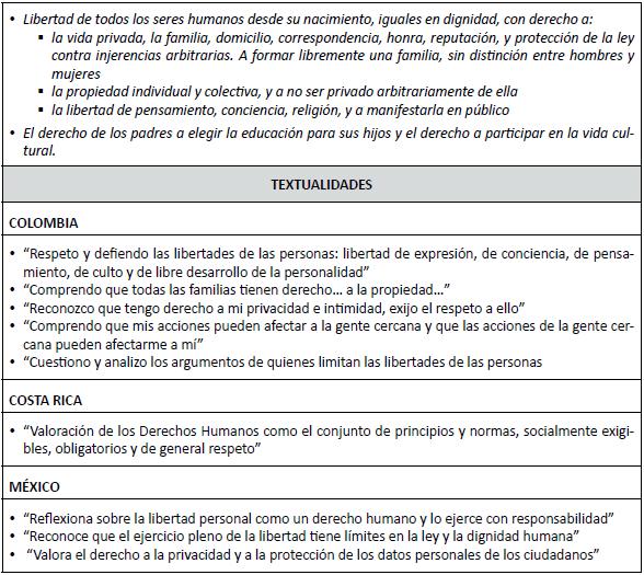 • Esta categoría se encuentra más desarrollada y explícita en los lineamientos de Colombia, refiriéndose a las diferentes expresiones de la libertad en la sociedad e identificando algunas de ellas. México reconoce también el pleno ejercicio de la libertad como un derecho y hace referencia, en particular, a la privacidad. En cambio, Costa Rica no explicita este derecho y sólo lo valora dentro del conjunto de los Derechos Humanos.