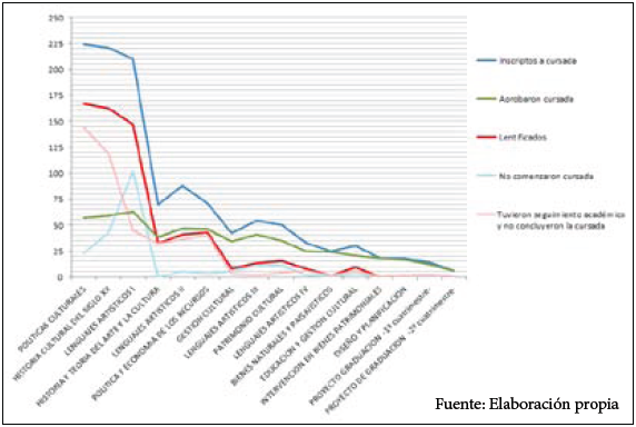 En dicha investigación se ha problematizado sobre cuál ha sido el comportamiento de la matrícula (cohorte 2009) en relación al desgranamiento y lentificación de la Tecnicatura Universitaria en Gestión Cultural de la Universidad Nacional de Mar del Plata.