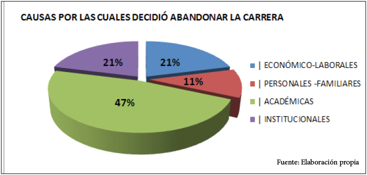 Si se analizan el Gráfico Nº 2 resultante de los datos obtenidos, se puede observar que el 47% es por motivos académicos y el 21% por causas relacionadas con la institución. Dicho en otras palabras,las principales causas del desgranamiento de ese 68%4 remiten a factores cuyo origen se encuentra en la institución y no a problemas personales.