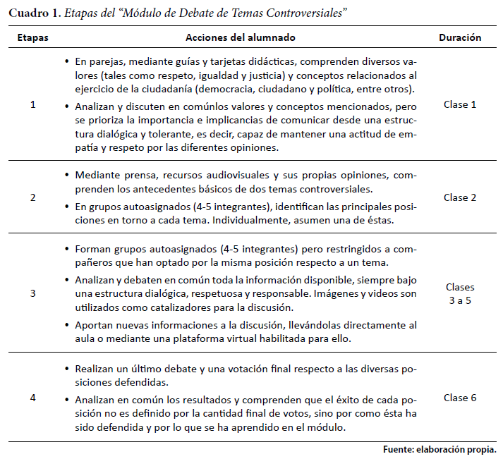 El denominado “Módulo de Debate de Temas Controversiales” se ha llevado adelante en seis clases, de 90 minutos cada una. Se han analizado y debatido dos cuestiones polémicas en la opinión pública chilena en aquel momento: la posible despenalización de la marihuana y la demanda marítima que el Gobierno boliviano mantiene contra su homólogo chileno en el Tribunal Internacional de La Haya. Entre los materiales utilizados se cuentan guías de trabajo grupal, tarjetas didácticas sobre valores universales, prensa, imágenes impresas y videos. En el Cuadro 1 se presentan las diversas etapas de esta propuesta.