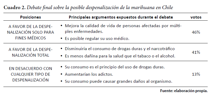 En el Cuadro 2, a modo de ejemplo, se indican las posiciones, principales argumentos y resultados de la votación final sobre la posible despenalización de la marihuana en Chile.