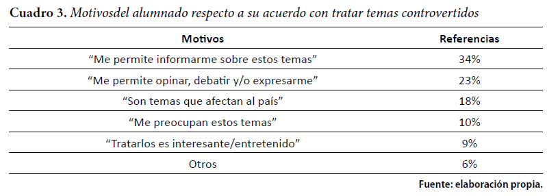 Un 99% de los jóvenes partícipes ha señalado en el cuestionario estar de acuerdo con tratar controversias en el aula. Sus motivos son expuestos en el Cuadro 3: